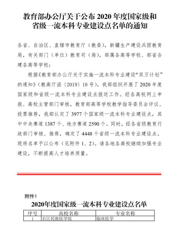 深化专业综合改革,提高专业建设成效。制定《一流本科专业建设实施方案》建设一批一流本科专业,引领带动其他专业主动整合资源,调整优化专业结构,创新人才培养模式,促进专业建设质量整体提升,推动形成高质量人才培养体系。目前学校共22个本科专业,涵盖了医学、文学、理学、管理学四个学科门类,其中医学类专业有15个,占比为68%。学校现有国家级一流本科专业建设点1个(通过教育部专业认证1个),自治区级一流本科专业建设点8个,广西高等学校优势特色专业7个、自治区特色专业及实验实训教学基地(中心)建设项目6项、自治区特色专业及课程一体化建设项目5项及国家民委人文社会科学重点研究基地1个,为基层培养“下得去、用得上、留得住”的高质量应用型医学人才打下坚实的基础。