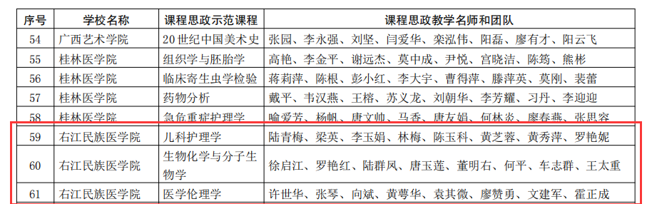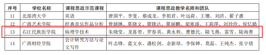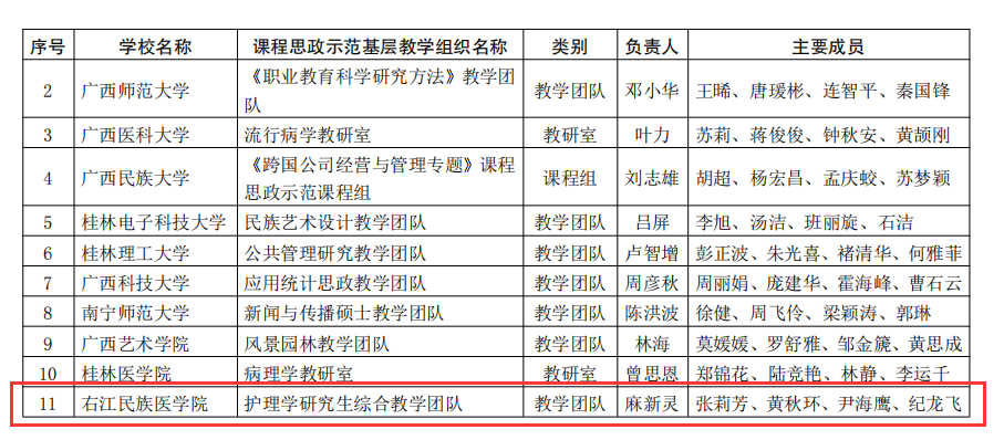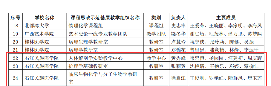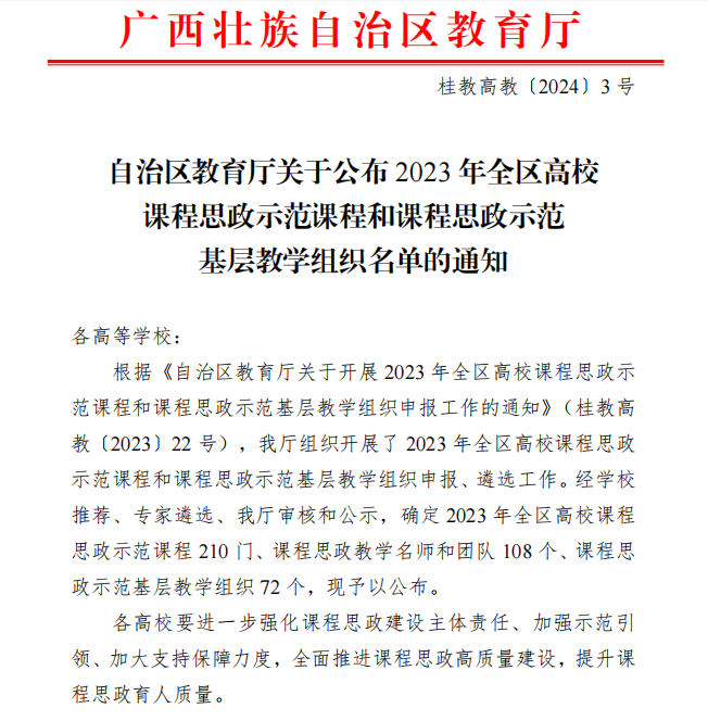 近日,自治区教育厅下发《关于公布2023年全区高校课程思政示范课程和课程思政示范基层教学组织名单的通知》(桂教高教〔2024〕3号),英国上市公司365共有4个基层教学组织获认定为2023年广西高校自治区级课程思政示范基层教学组织、4门课程获认定为自治区级课程思政示范课程,获得课程思政示范课程的相应授课教师和教学团队同时被认定为自治区级课程思政教学名师和教学团队(具体名单见下图)。